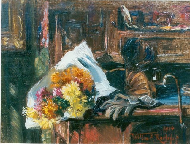 Willem Elisa Roelofs jr. | Stilleven met chrysanten en handschoenen, olieverf op doek op paneel, 13,0 x 18,0 cm, gesigneerd r.o. en gedateerd 1914