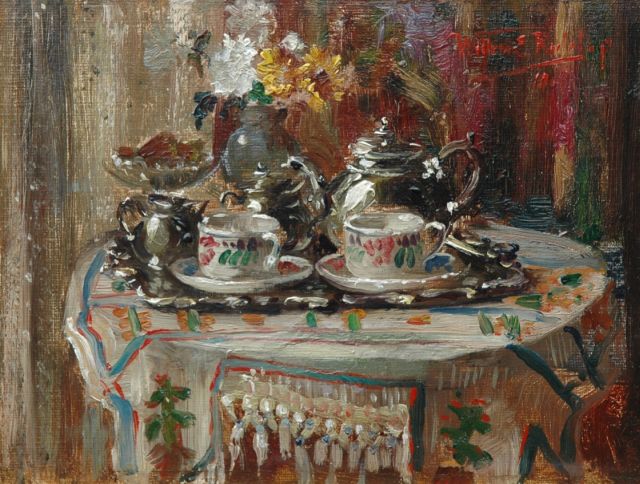 Willem Elisa Roelofs jr. | De theetafel, olieverf op schildersboard, 14,0 x 19,5 cm, gesigneerd r.b. en verso