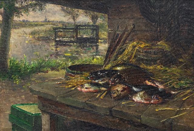 Willem Elisa Roelofs jr. | Oude vismijn aan het water, olieverf op doek, 31,5 x 46,0 cm, gesigneerd l.o. op rand van de tafel
