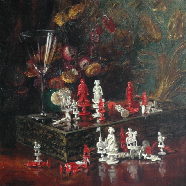 Willem Elisa Roelofs jr. | Stilleven met Chinese schaakstukken, olieverf op doek, 45,5 x 45,7 cm, gesigneerd l.o.