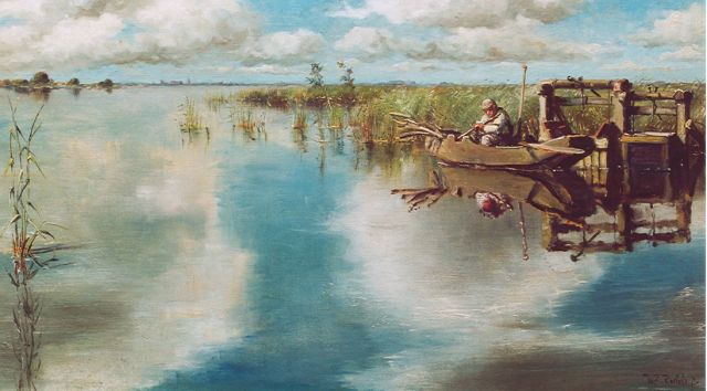 Willem Elisa Roelofs jr. | Visser in roeiboot bij visbunnen, olieverf op doek, 40,4 x 70,2 cm, gesigneerd r.o.