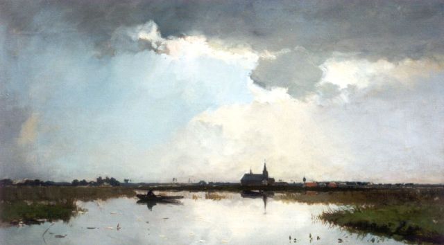 Willem Weissenbruch | Plasgezicht met visser, een kerk aan de einder, olieverf op doek, 35,4 x 60,3 cm, gesigneerd l.o.