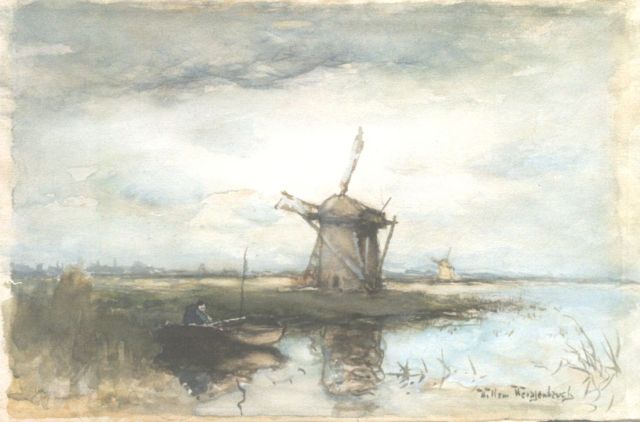 Willem Weissenbruch | Polderlandschap met molen en vissersschuit, aquarel op papier, 19,2 x 29,5 cm, gesigneerd r.o.