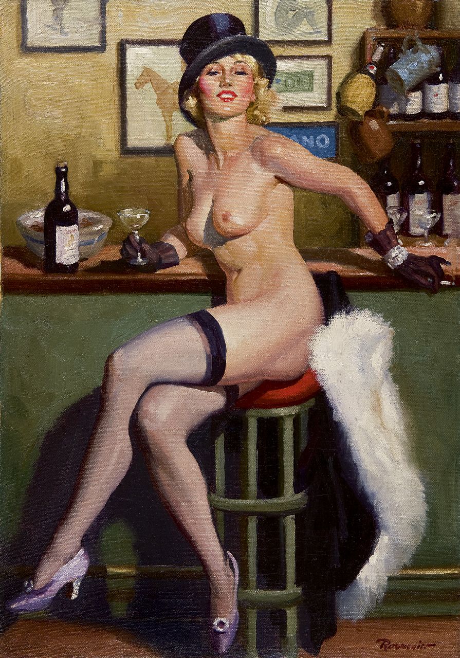 'Entertainment aan de bar', van de Amerikaanse schilder-illustator William Reusswig, werd in de jaren 30 gebruikt als illustratie voor een van de jaarboeken van de Dutch Treat club, het beroemde gezelschap van schrijvers, journalisten, uitgevers en illustratoren in New York. Deze jaarboeken voor de leden stonden bekend om hun prikkelende afbeeldingen, die aansloten op de populariteit van het ‘pin-up’ genre in die tijd. De pin-up, de ‘all American girl’ in een gewaagde pose, was in Amerika in de jaren 20 en 30 een grote rage, en veel gerenommeerde kunstenaars hielden zich met het genre bezig. William Reusswig maakte ook illustraties en omslagafbeeldingen voor talrijke tijdschriften en stuiverromans zoals 'Adventure en Dime Detective Magazine', die met mooie, schaars geklede meisjes op de omslag lezers lokten.