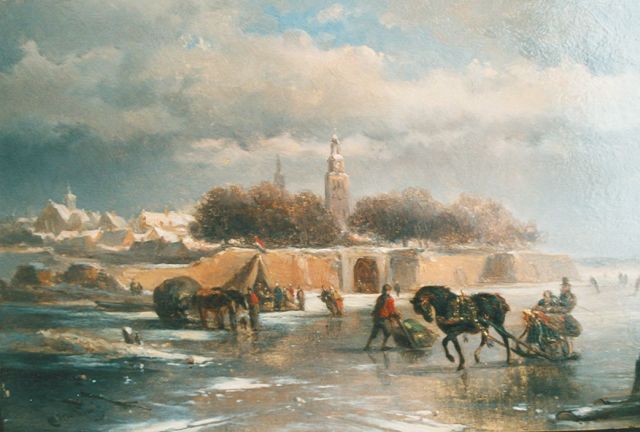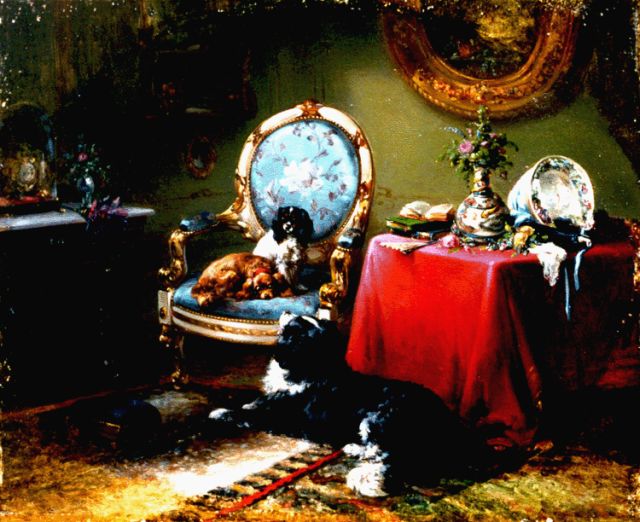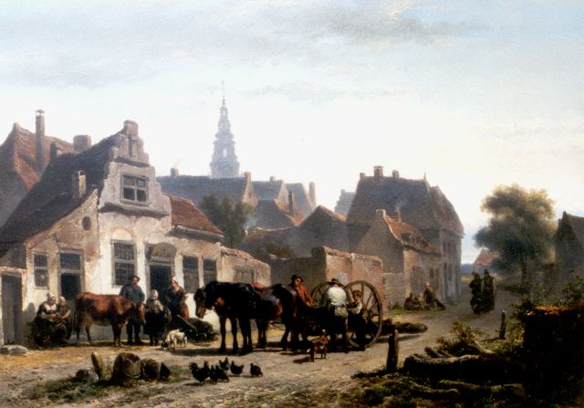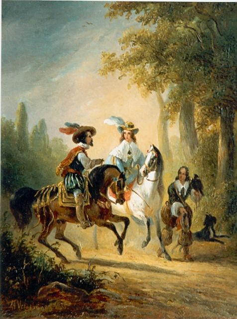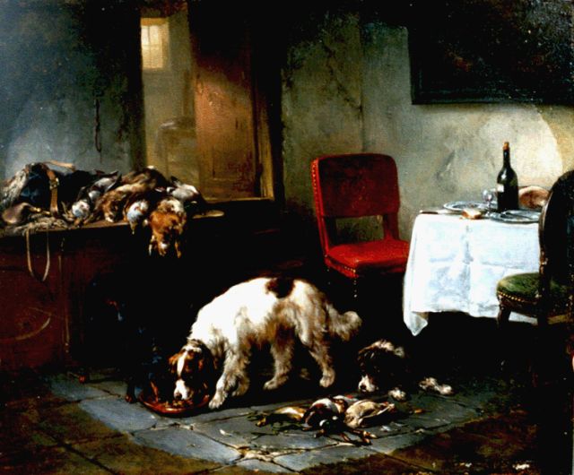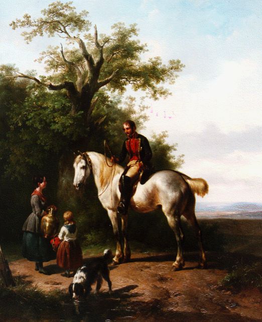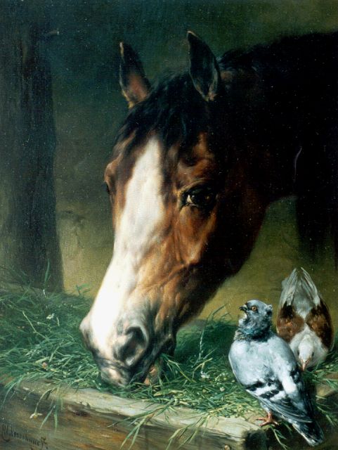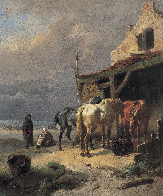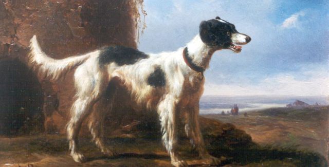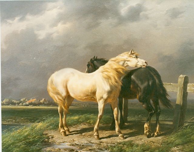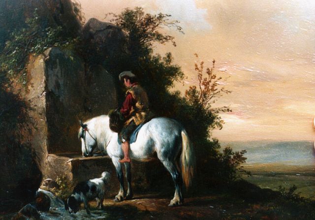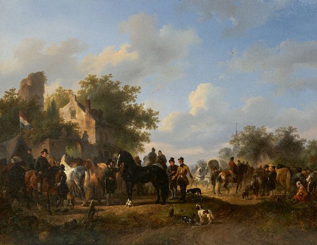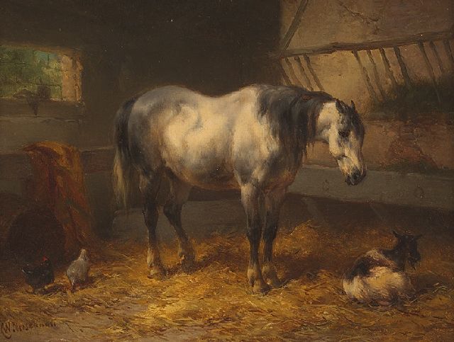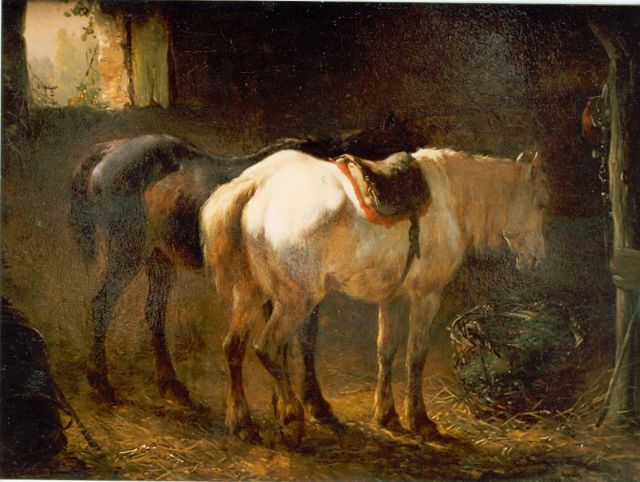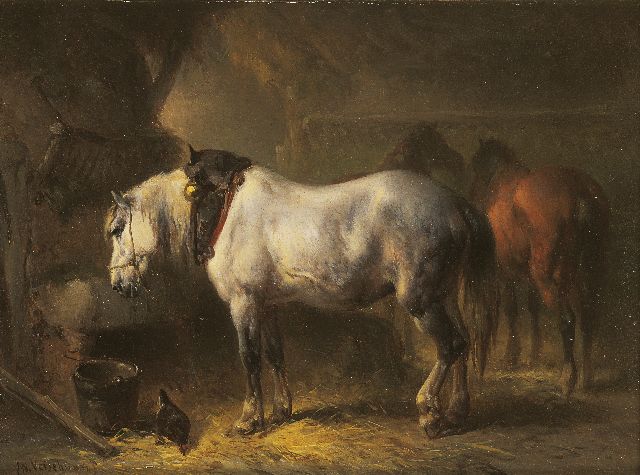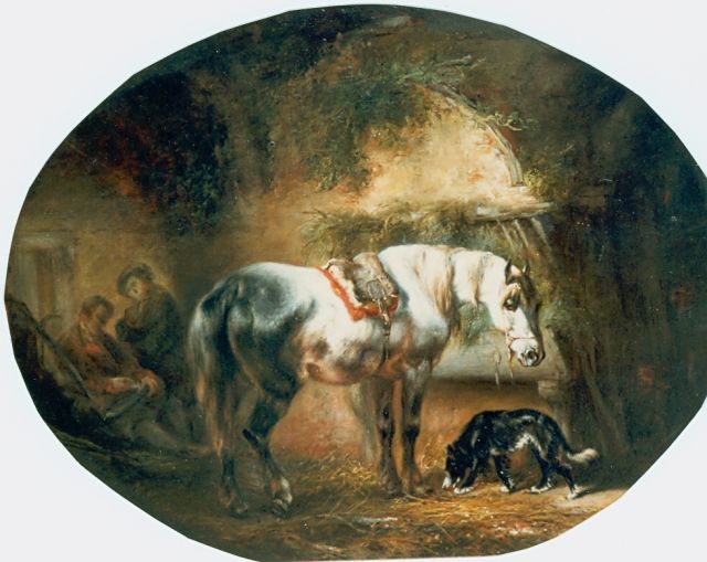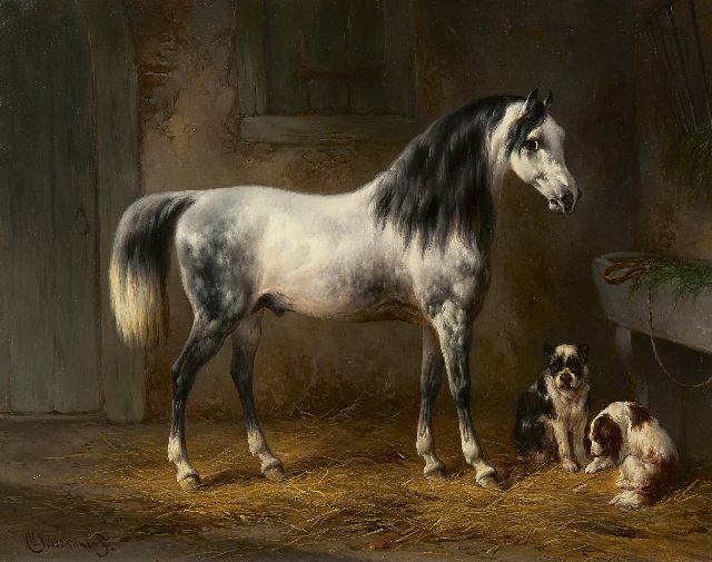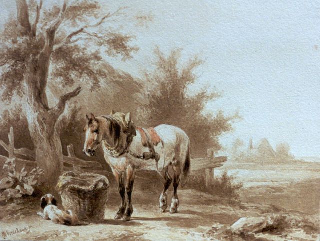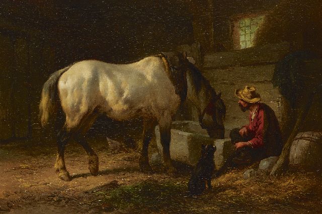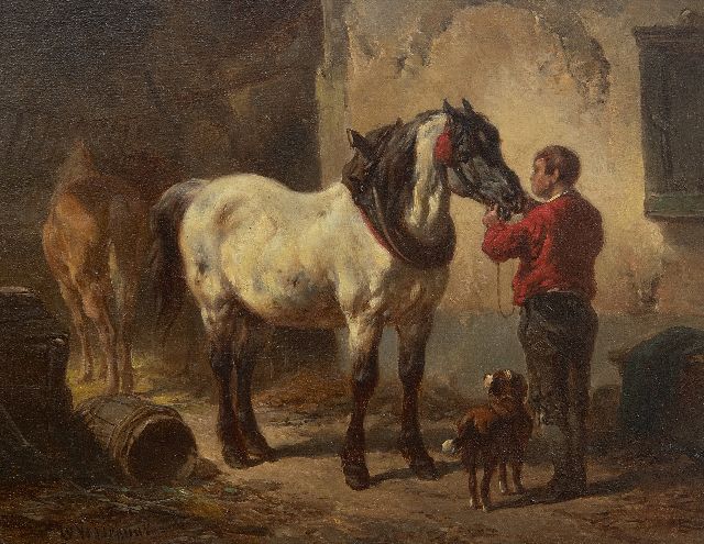 Wouterus Verschuur is in zijn tijd al een beroemd paardenschilder. Van zijn leermeester, de vroeg-romantische veeschilder P.G. van Os, leert hij hun bouw en bewegingen tot in de perfectie vast te leggen en had hij, net als de Britse 18e-eeuwse George Stubbs belangstelling voor hun karakter. De compositorische schema’s en de stoffering keek hij af van de 17e-eeuwse Philips Wouwerman: op de achtergrond een stalopening met een schimmel in een lichtbundel als blikvanger, centraal geplaatst in de voorstelling; paarden in allerlei houdingen en vanuit diverse hoeken, betrokken in allerlei activiteiten. Zo schilderde hij sterke boerenpaarden op stal en energieke tuigpaarden, maar ook ranke rijpaarden tijdens een middagrit met hun welgestelde eigenaren. Tot diep in de negentiende eeuw hadden paarden nog dezelfde plaats en functie als in de zeventiende eeuw en was de infrastructuur voor paarden in hoofdzaak dezelfde. Tot laat in de 19e eeuw werden paarden – en ook andere dieren – min of meer geïdealiseerd weergegeven. Ze vervulden een belangrijke maatschappelijke functie als vervoersmiddel voor mensen en goederen, als trekpaard om het land te bewerken, als militair paard in oorlogstijd en tijdens de jacht. En in Nederland niet te vergeten als trekpaard voor kleinere schepen langs de trekvaarten. Vanaf einde 19e eeuw gaan de impressionisten het dier anders zien en wordt de uitbeelding natuurlijker en minder geposeerd. Verschuur was ook een knap hondenschilder. Deze dieren komen op de meeste van zijn schilderijen dan ook voor.