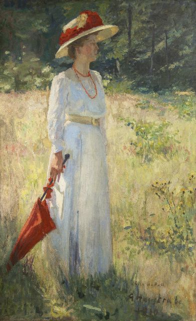 Gaston Haustrate | Dame met rode parasol, olieverf op doek, 179,4 x 111,1 cm, gesigneerd r.o. en gedateerd 1910