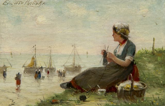 Edward Portielje | Breien op het duin (pendant van 17476), olieverf op doek, 9,4 x 14,8 cm, gesigneerd l.b.