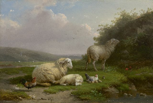 Frans van Severdonck | Ooi en lam in een landschap, olieverf op paneel, 17,6 x 23,9 cm, gesigneerd l.o. en gedateerd 1865, zonder lijst
