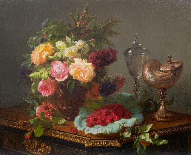 Jean-Baptiste Robie | Stilleven met rozen, vruchten en een nautilusbeker, olieverf op paneel, 63,0 x 77,8 cm, gesigneerd r.o.