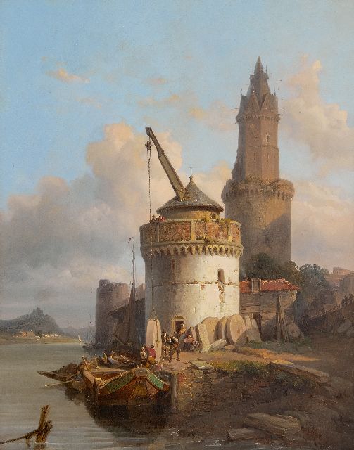François Bossuet | Het laden van molenstenen in Andernach aan de Rijn, olieverf op paneel, 39,5 x 31,0 cm, gesigneerd op de boeg van het schip