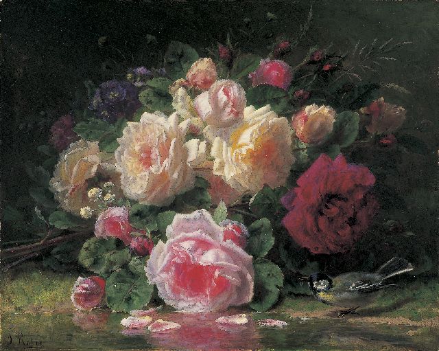 Jean-Baptiste Robie | Rozen en koolmees aan de vijverrand, olieverf op paneel, 42,0 x 52,0 cm, gesigneerd l.o.