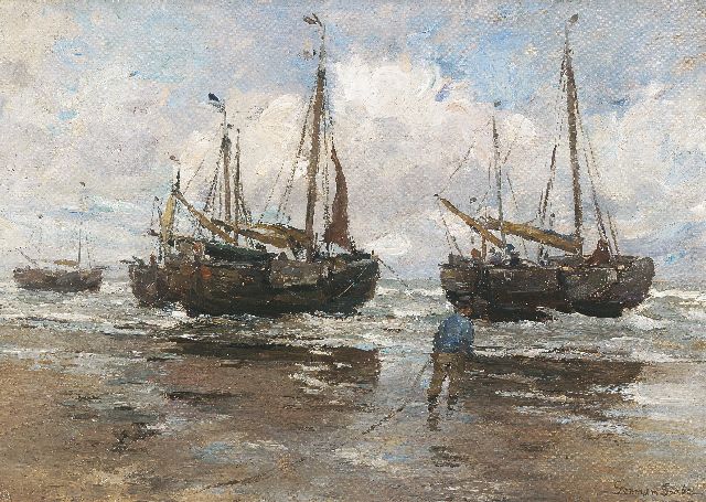 Heinrich Heimes | Uitvarende vissersschepen bij Katwijk, olieverf op doek, 80,1 x 60,1 cm, gesigneerd l.o.