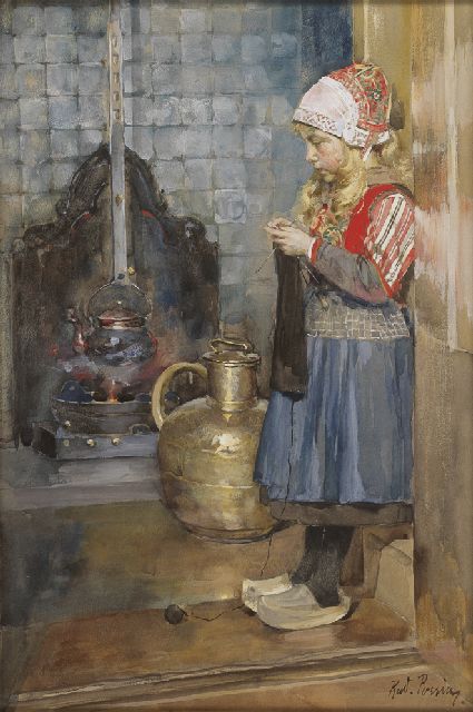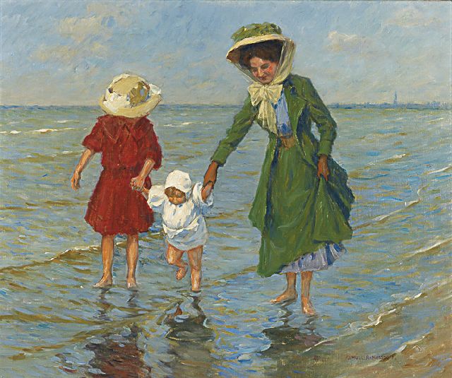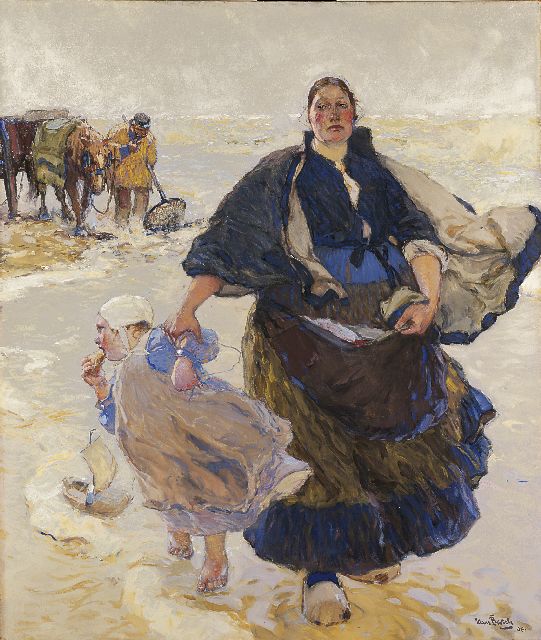Mijmering: vissersvrouw met kind op het strand van Katwijk