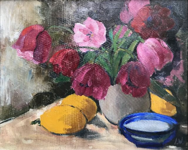 Jan Wiegers | Stilleven met tulpen, olieverf op doek, 45,1 x 55,0 cm, gesigneerd r.o. met initialen