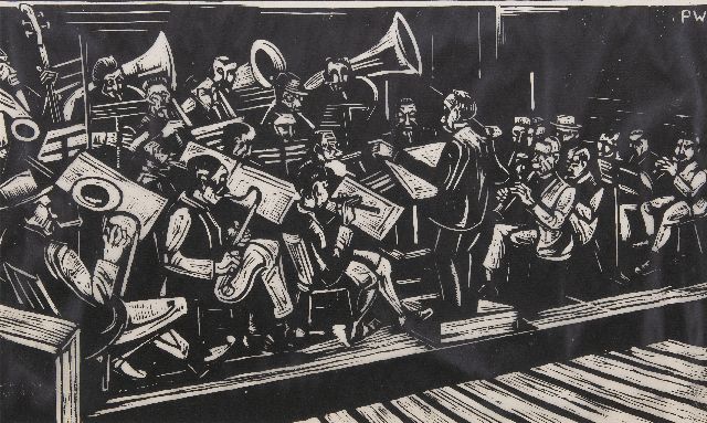 Piet Wiegman | De Koninklijke Harmonie van Thorn, houtsnede, 33,0 x 53,5 cm, gesigneerd r.b. met initialen in het blok en te dateren ca. 1925
