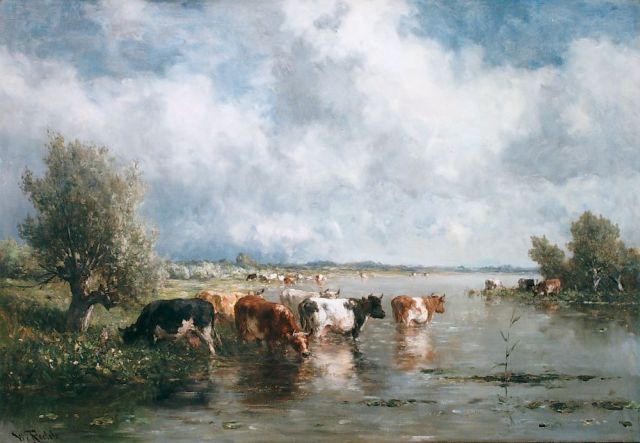 Willem Roelofs | Koeien aan het water, olieverf op doek, 70,0 x 101,0 cm, gesigneerd l.o