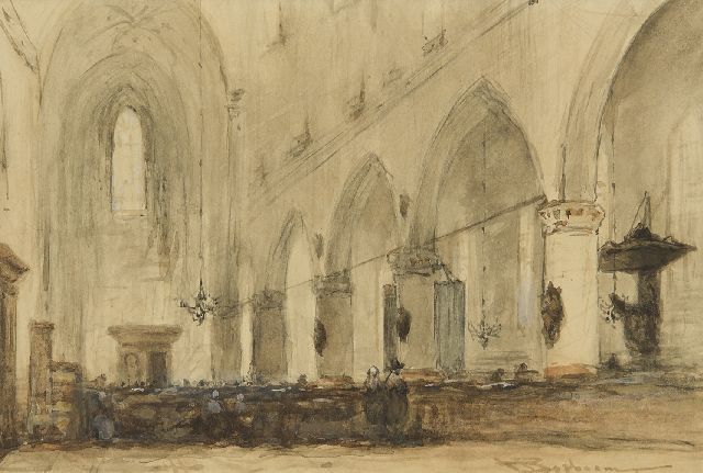 Johannes Bosboom | Kerkinterieur met figuren, aquarel op papier, 26,5 x 18,3 cm, gesigneerd l.o.