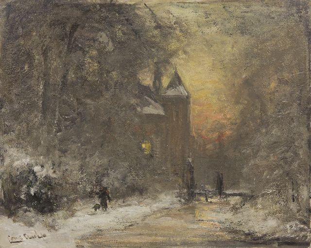 Louis Apol | Man met hooikar op besneeuwd bospad, olieverf op doek, 32,6 x 40,5 cm, gesigneerd l.o.