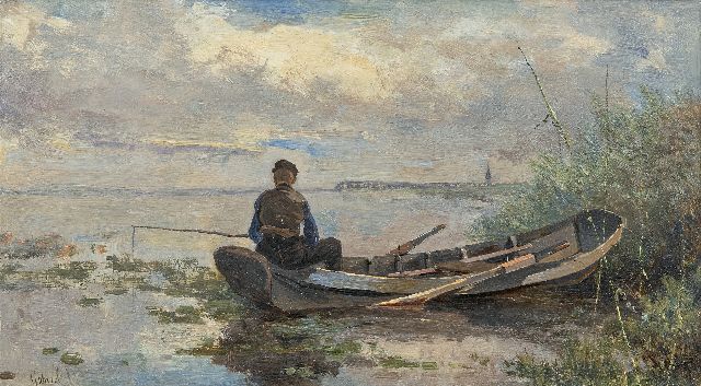 Constan Gabriel | Polderlandschap met visser in een bootje, olieverf op paneel, 18,9 x 32,7 cm, gesigneerd l.o.
