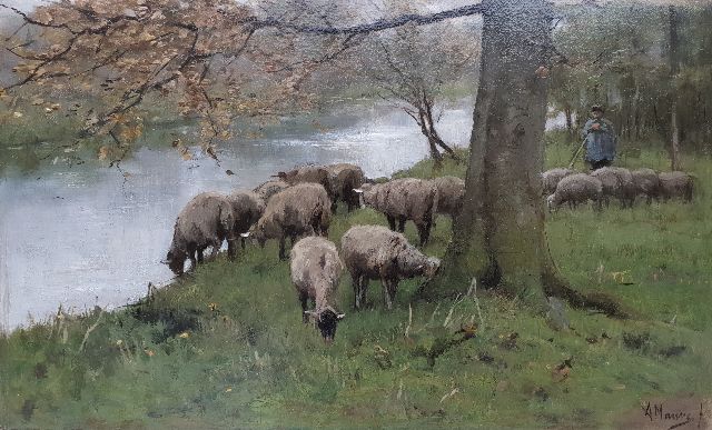 Anton Mauve | Schapen aan de vaart, olieverf op paneel, 25,1 x 41,0 cm, gesigneerd r.o.