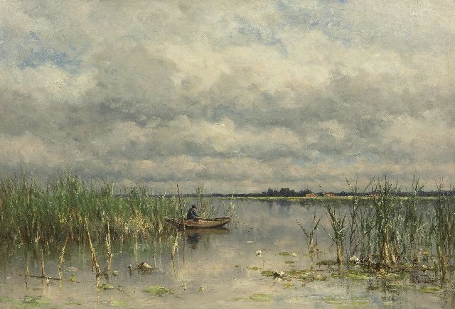 Polderlandschap met visser in een bootje