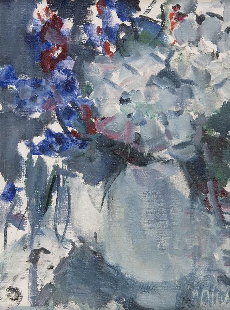 Milène Wolters-Schweitzer | Stilleven van bloemen in een vaas, olieverf op doek, 39,8 x 29,9 cm, gesigneerd r.o. en op spieraam en op spieraam gedateerd 2014