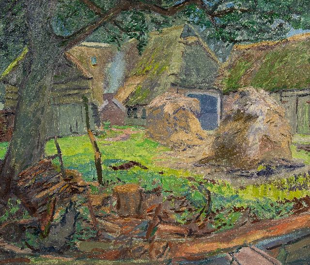 Jannes de Vries | Boerenerf met hooischelven, olieverf op doek, 60,4 x 70,8 cm, gesigneerd verso met monogram