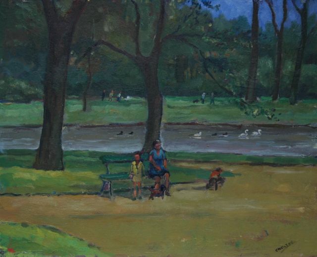 Cornelis Groeneveld | Breiende vrouw aan bosrand, olieverf op doek, 64,0 x 76,3 cm, gesigneerd l.o.
