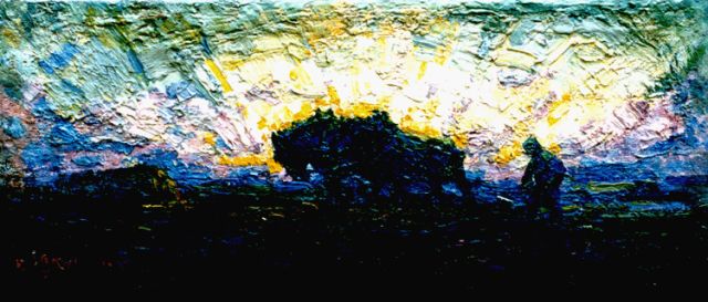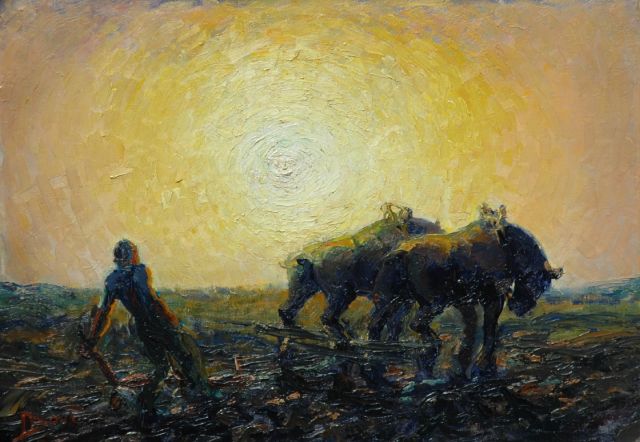 Herman Gouwe | Ploeger bij zonsondergang, olieverf op doek, 14,0 x 32,3 cm, gesigneerd l.o. en gedateerd 1917