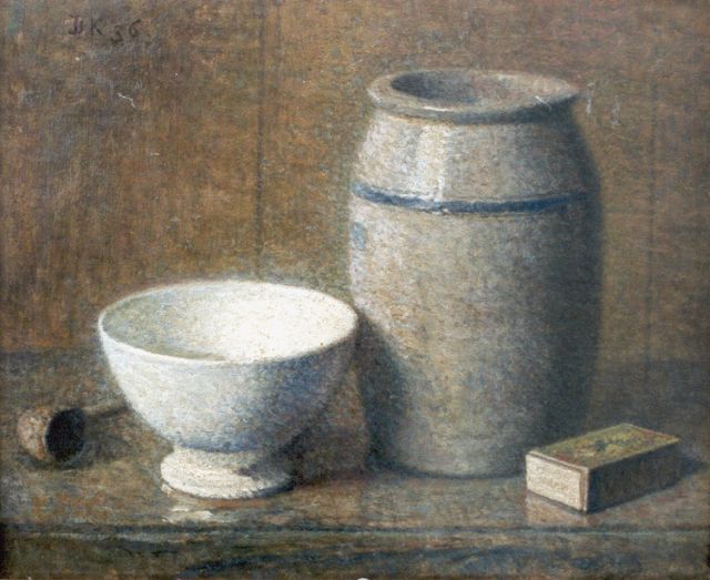 Douwe Komter | Stilleven met Keulse pot en kom, olieverf op schildersboard, 27,0 x 32,4 cm, gesigneerd l.b. ini en gedateerd '36
