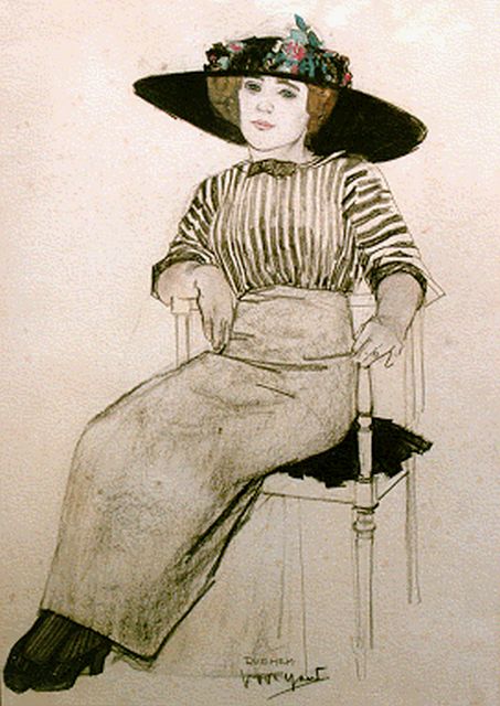 Piet van der Hem | Dame met hoed in stoel, potlood en aquarel op papier, 47,5 x 32,5 cm, gesigneerd m.o.