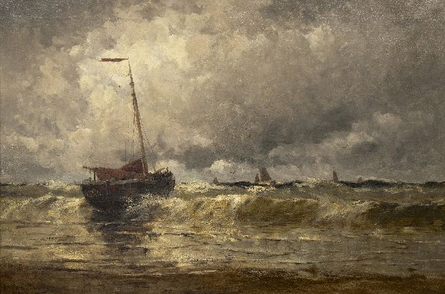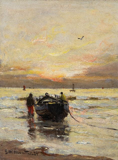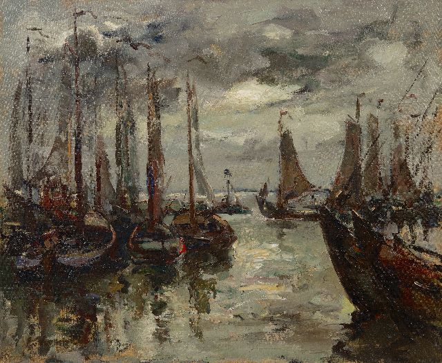 Morgenstjerne Munthe | Binnenvarende vissersschepen, Katwijk, olieverf op doek op paneel, 22,9 x 35,8 cm, gesigneerd l.o.
