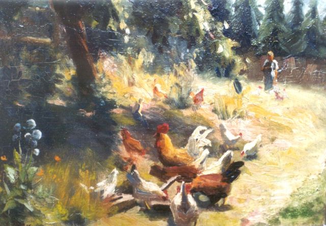 Evert Pieters | Kippen in een boomgaard, olieverf op board, 26,7 x 35,3 cm, gesigneerd l.o.