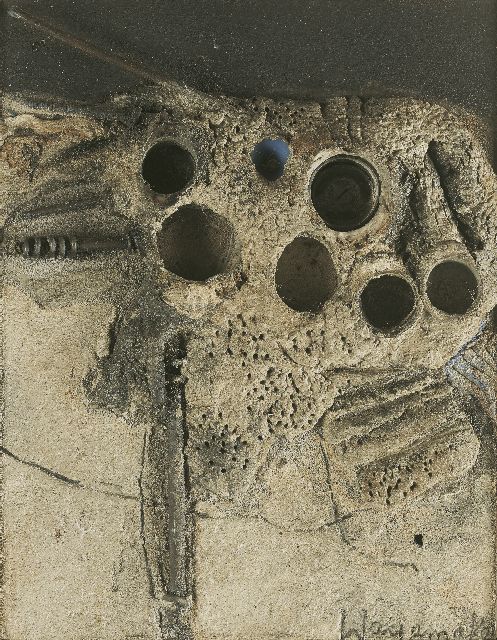Jacques van der Heyden | Abstracte compositie, olieverf en zand op papier op board, 27,5 x 19,2 cm, gesigneerd l.o. en gedateerd '57