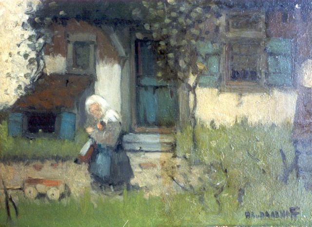 Henri van Daalhoff | Voor de deur van moeder, olieverf op paneel, 12,0 x 16,0 cm, gesigneerd r.o. en gedateerd 1904