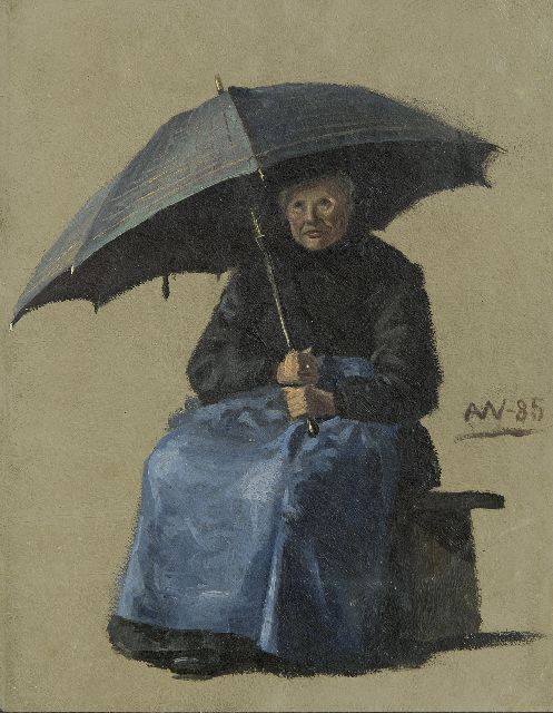 Anna Wengberg | Een vrouw zittend onder een paraplu, olieverf op papier op board, 33,5 x 26,0 cm, gesigneerd r.m. met monogram en gedateerd '85