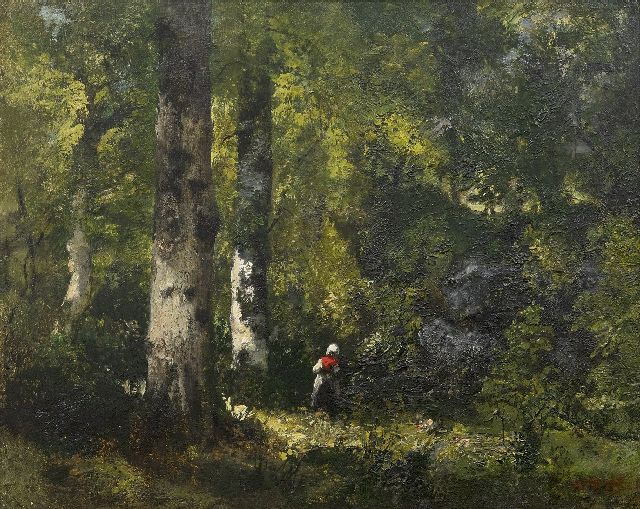 Narcisse Virgile Diaz de la Peña | Houtsprokkelaarster in het bos van Fontainebleau, olieverf op schildersboard, 32,3 x 40,6 cm, gesigneerd r.o.