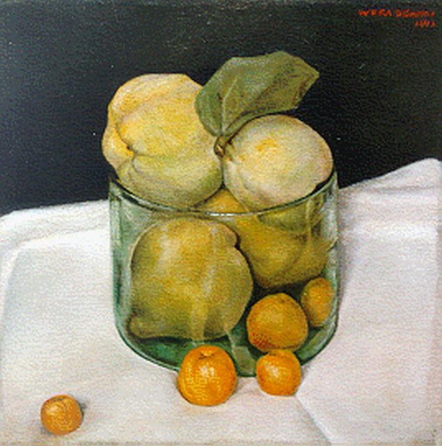 Wera Schmid-Wittenberg | Stilleven van kweeperen en abrikoosjes, olieverf op doek, 25,5 x 25,2 cm, gesigneerd r.b. en gedateerd 1947