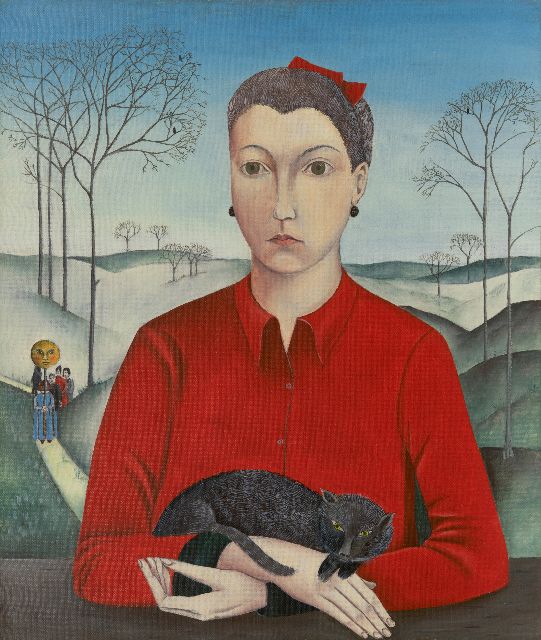 Dieter Matthäus | Vrouw in rode blouse met kat, olieverf op doek, 65,2 x 55,3 cm, gesigneerd verso en verso gedateerd 9 november 1964