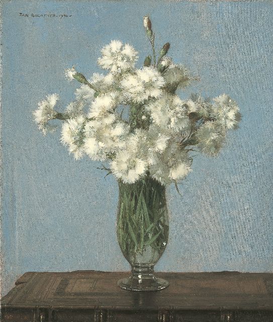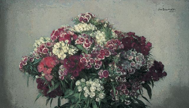 Jan Bogaerts | Anjers in glazen vaas, olieverf op doek, 35,2 x 30,2 cm, gesigneerd l.b. en gedateerd 1936