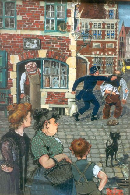 Oscar Hoge | Opgepakt door de politie, aquarel en gouache op board, 42,8 x 29,8 cm, gesigneerd r.o. en gedateerd 28-12-1914
