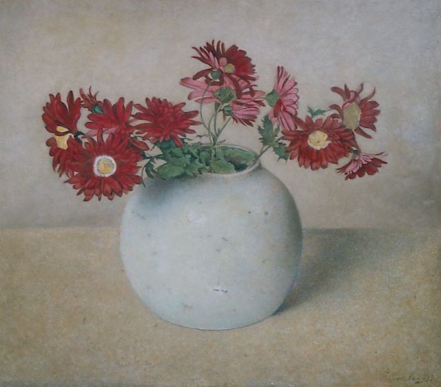 Frans Everbag | Rode chrysanten in witte pot, olieverf op paneel, 30,1 x 33,9 cm, gesigneerd r.o. en gedateerd '38