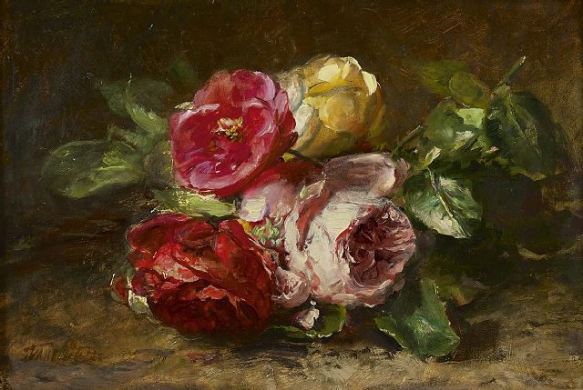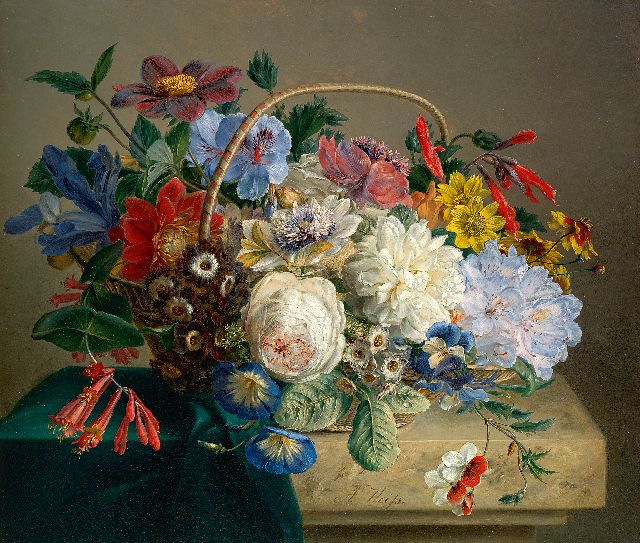 Anton Weiss | Pronkboeket in een mand, olieverf op paneel, 30,7 x 36,4 cm, gesigneerd m.o.