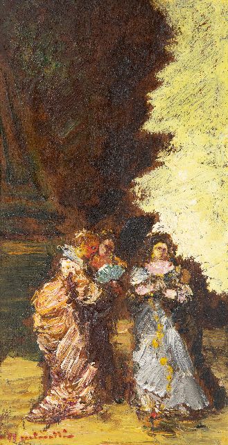 Adolphe Monticelli | Trois femmes dans un parc, olieverf op board op paneel, 29,3 x 16,0 cm, gesigneerd l.o.