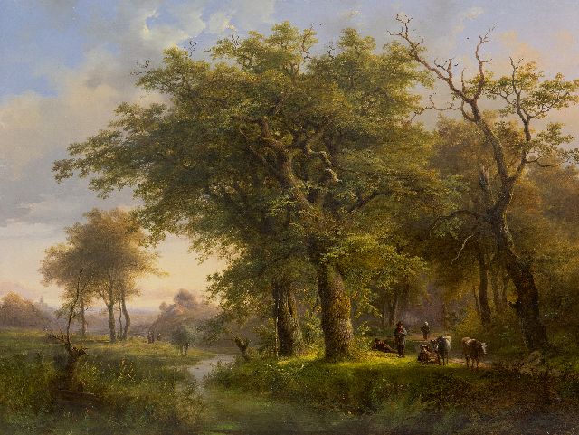 Johann Bernard Klombeck | Bebost beekdal met vee en landvolk, olieverf op paneel, 47,6 x 62,5 cm, gesigneerd l.o. en gedateerd 1857