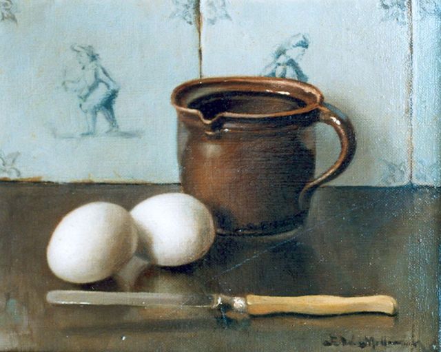 Pieter Wilhelm Millenaar | Twee eieren, een kom en een mes voor een tegelwand, olieverf op doek, 20,2 x 25,2 cm, gesigneerd r.o.