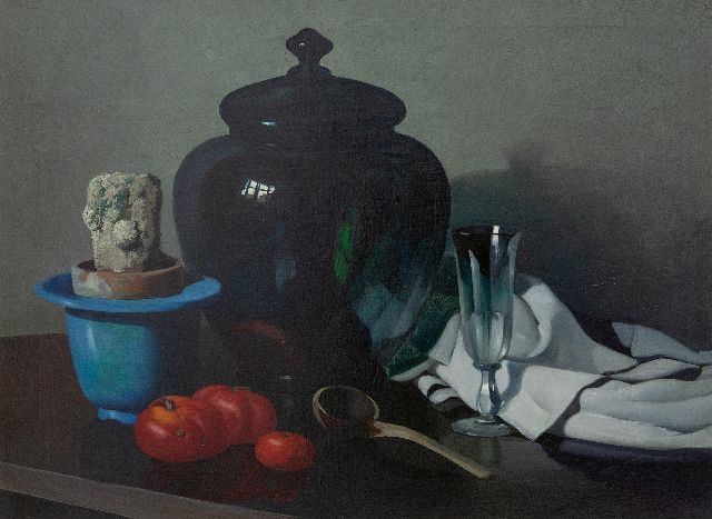 Jan Strube | Stilleven met tinnen kan, citroen en tomaten, olieverf op paneel, 31,1 x 40,8 cm, gesigneerd r.b. en gedateerd '53