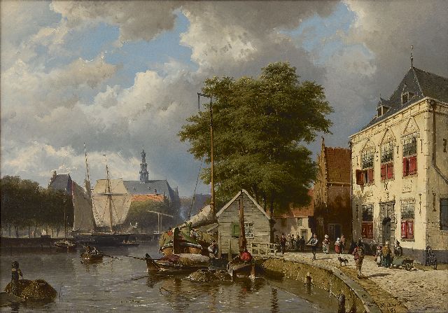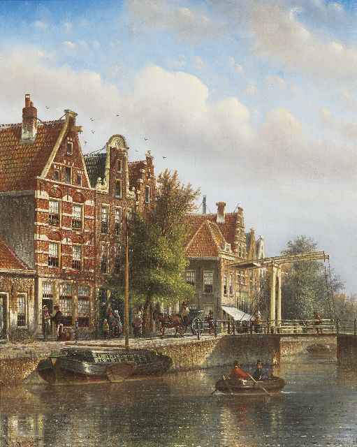Adriaan Vrolijk | Hollandse stadsgracht met scheepvaart en figuren, olieverf op paneel, 38,6 x 52,4 cm, gesigneerd r.o.