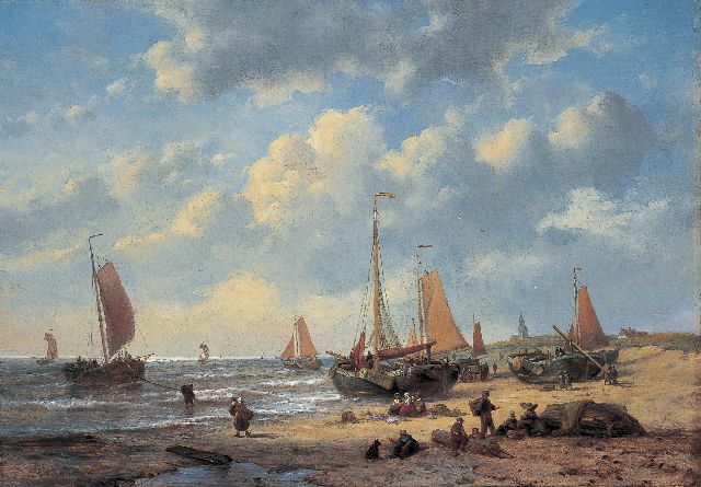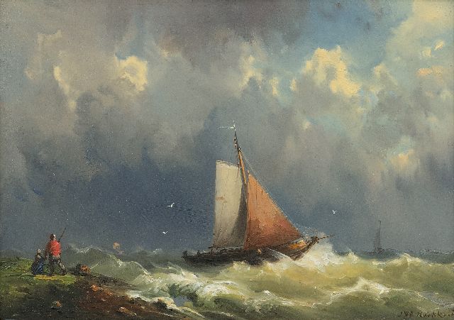 Hermanus Koekkoek | Een stevige bries aan Hollandse kust met dorp in het verschiet, olieverf op doek, 37,0 x 57,7 cm, gesigneerd l.o.