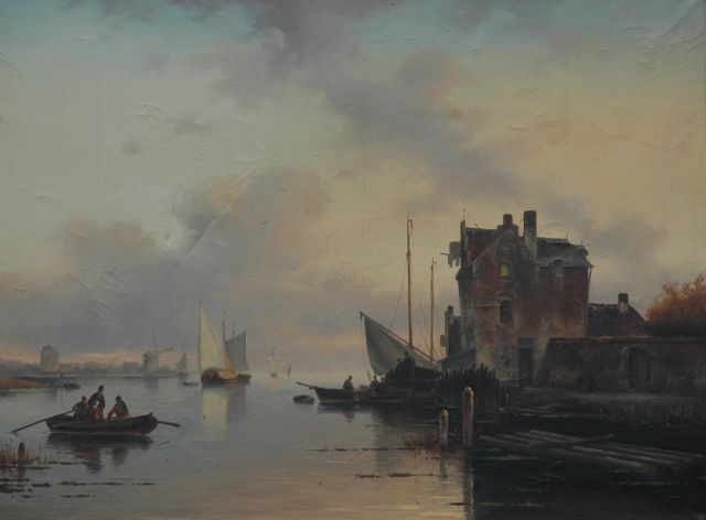 Hollandse stadsgracht met scheepvaart en figuren